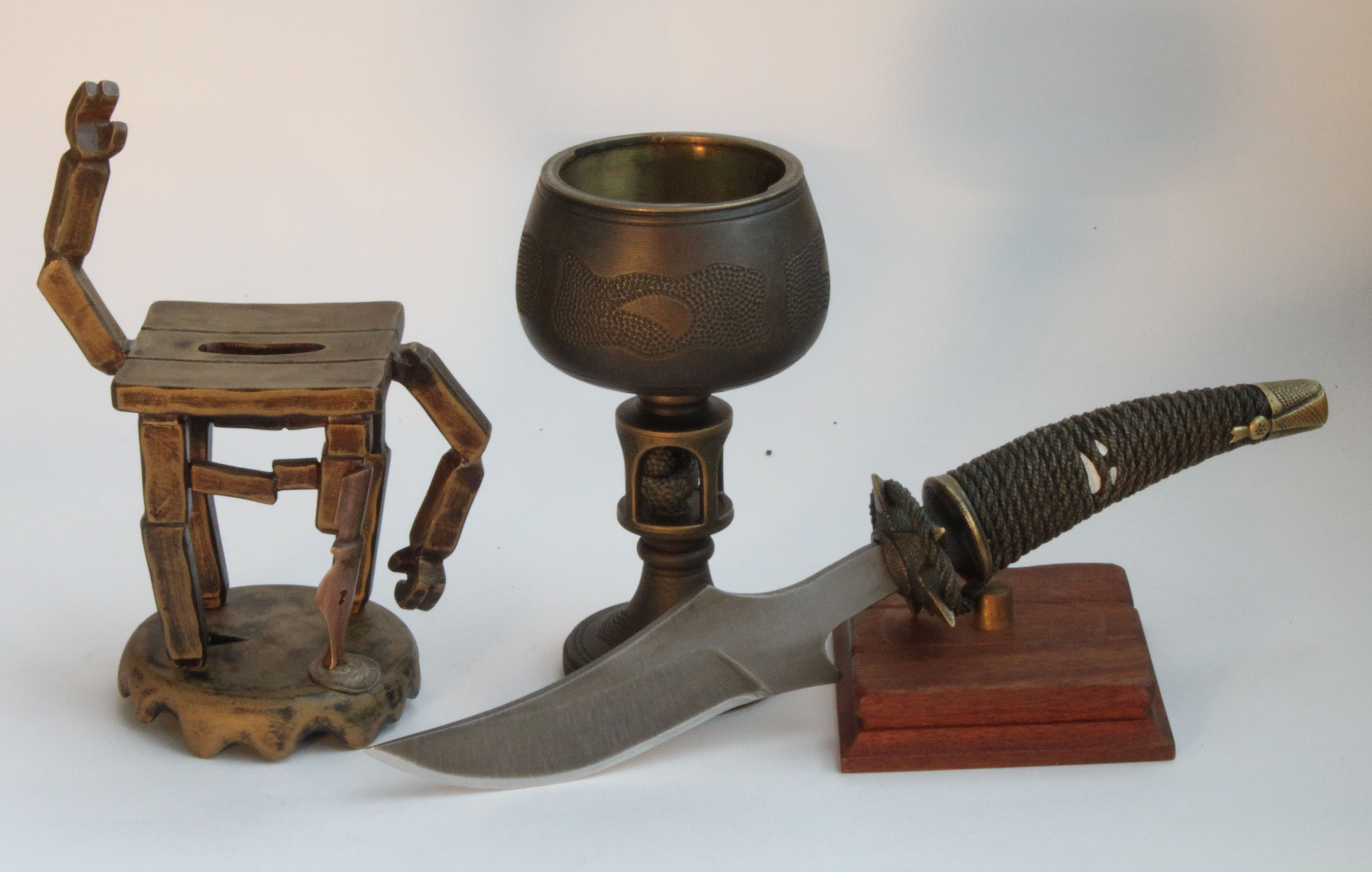 Сталь, бронза, монета (1925г.), шнур, красное дерево.