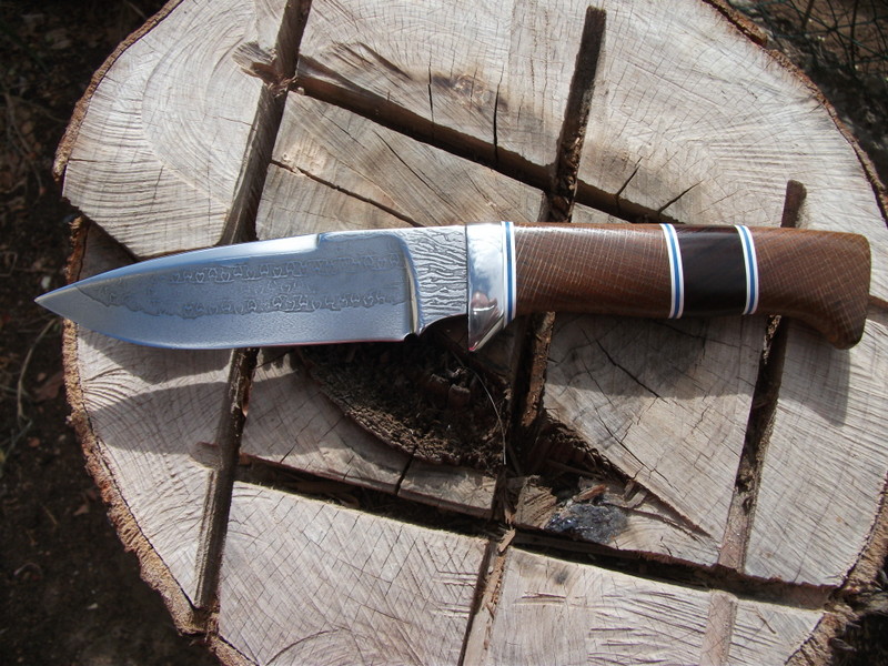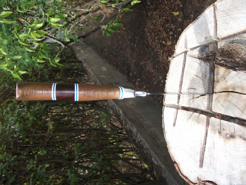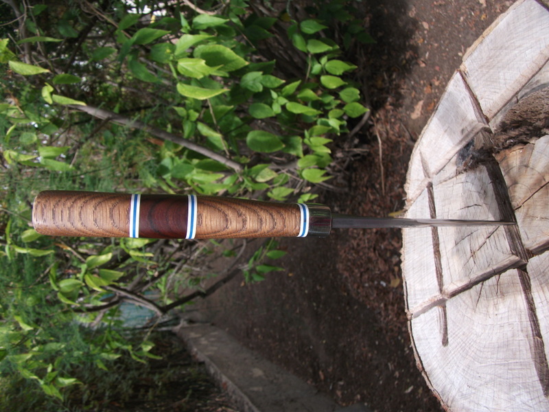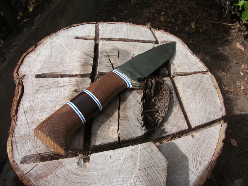 Рукоять- дуб поперечнего среза, орех, пластик белого и синего цвета. Пропитка маслом, полировка с воском.