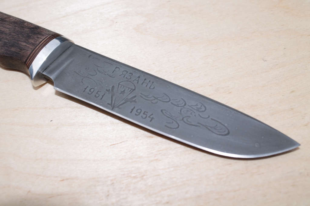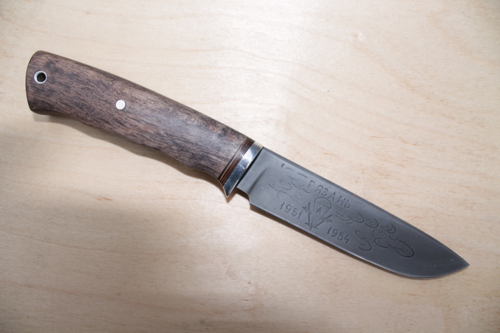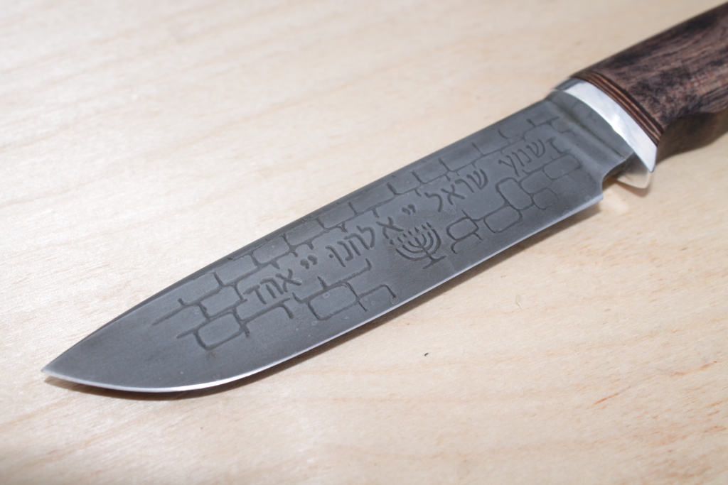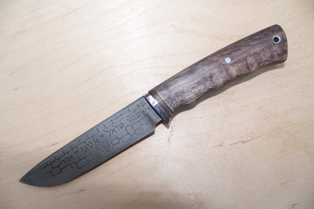 Приветствую ВСЕХ!!!Давно небыл здесь,но такую задумку и решение не могу умолчать.К моему счастью мне давелось познакомиться с бывшим главой Таганрогской Еврейской общины.Танха Моисеевич Отерштейн,81 год.Его книга"Евреи Таганрога" есть в музее "Яд Вашем",Благодаря ему у нас в "Балке Смерти",поставлен памятник Еврейским Детям,загубленым фашистами,поимённо.Человек чудом спассья в оккупацию.Пошёл против ортодоксальной семьи,полюбив русскую девушку.Отслужил в ВДВ.Сейчас борется с админестрацией за этот памятник.Они говорят -"чего вы выпячиваетесь,здесь и русские дети лежат".Но о них так не вспомнил никто и ни чего ни сделал ,как Танха о еврейских детях.Он столько пережил и переживает,на одном из мероприятий я у него спросил-"как Вы не озлобились на ВСЁ это."Он ответил-"Б-г есть и он всё видит,надо радоваться,что мы живы и живы ВСЕ кто живёт,а остальное -будет хорошо,только не надо не унывать". Нож -Еврею ,Десантнику-Большому ЧЕЛОВЕКУ.Клин-117-26-3,3мм 9ХФ,твёрд.-58ед.,хвост.-75мм,монтаж всадной на эпоксидку.Травление в ХЖ.Ручка-112мм,дерево- похоже на белый дуб,морёное,дельта,дюраль-В95.Ножны от Елены,кожа.Задумка была,сделать нож, похожий на "дембельский альбом",простовато,но понятно.Сегодня, 9 Мая поедим к нему с детьми и поздравим с праздником.ВСЕХ.ВСЕХ,ВСЕХ, С ПРАЗДНИКОМ ПОБЕДЫ!!! Если есть ошибки ,поправте,я не силён в ИВРИТЕ,как и Танха,я исправлю.