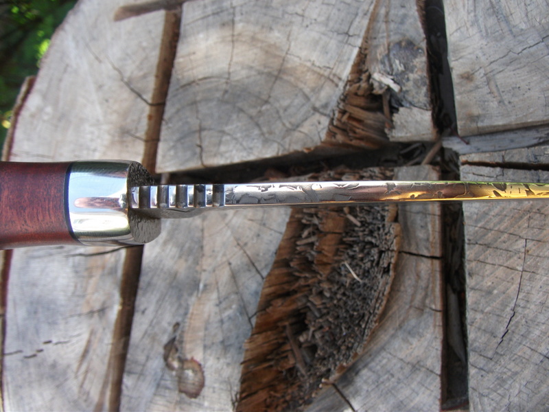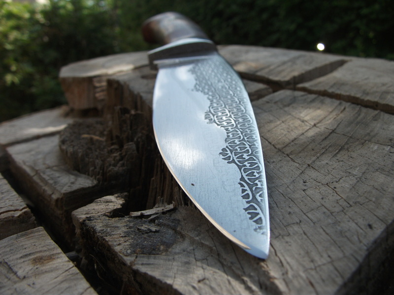 Клинок сведен от обуха в 0,2мм, трех слойное травление, заточен до строгания человеческого волоса