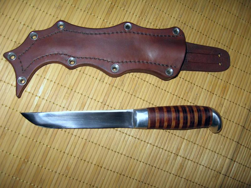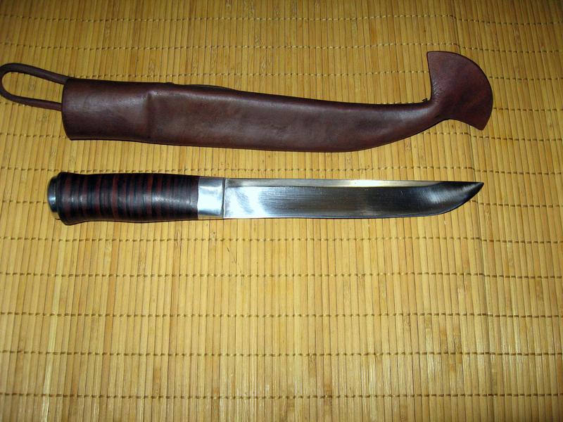 Молодца Леха! Я не разобрал, на финочке вогнутые спуски? А ножны именно финские, а не скандинавские, правда без рюшичек ;):), да и сделаны подобротней, у финов просто две половинки, а тут по моему еще и клинышек из кожи вставлен, под шов. Не? Леха где описание? как корячился, как оковки (или не оковки) делал?, кожу набирал? Эта та кожа? ;):) Короче- описание плиз! И шов на ножнах Леуку пожалуйста! ;):)