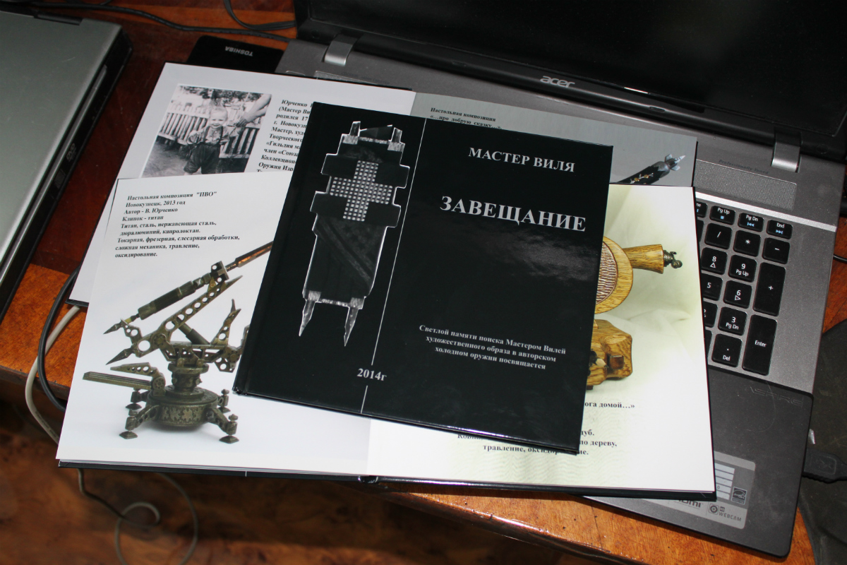 Работа почти полностью выполнена методом токарной, фрезерной обработки и конечно не без участия слесарных тисков и напильника. Из всего многообразия техник применяемых в изготовлении АХО, автор отдаёт предпочтение одной, это взять кусок металла и отсечь лишнее. Механика композиции выполнена по принципу весов, и работает от веса клинка.