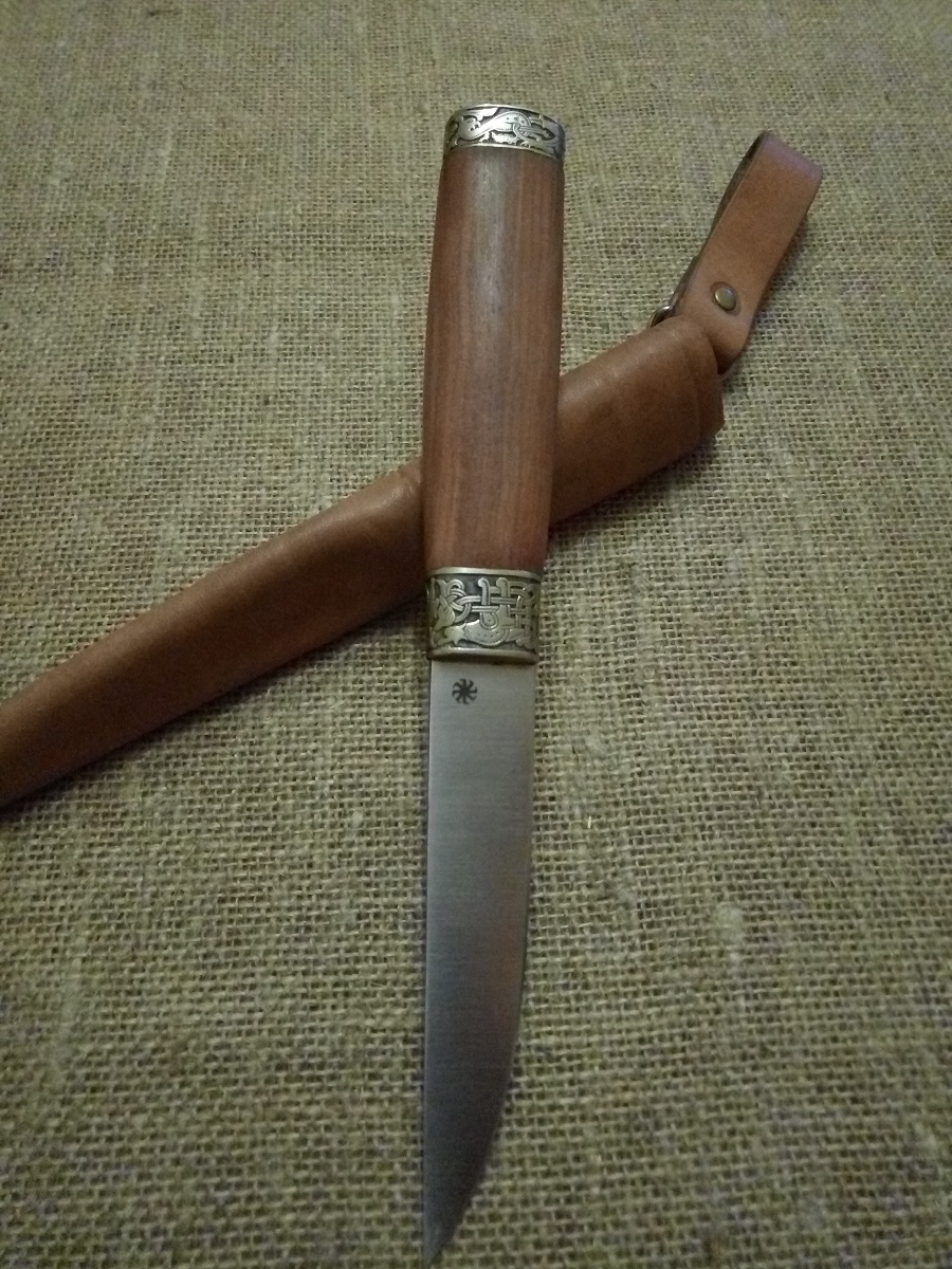 Ножи делаю от начала до конца: сам выбираю сталь, рисую эскиз, кую поковку, делаю больстер, рукоять, шью ножны, затачиваю… Правда, теперь жена помогает шить ножны и увлеклась скримшоу. И, положа руку на сердце: если бы не Наталия - давно бы я это дело бросил, наверно. Очень сильно она поддерживает, можно сказать - она мой самый строгий цензор и путеводная звезда.