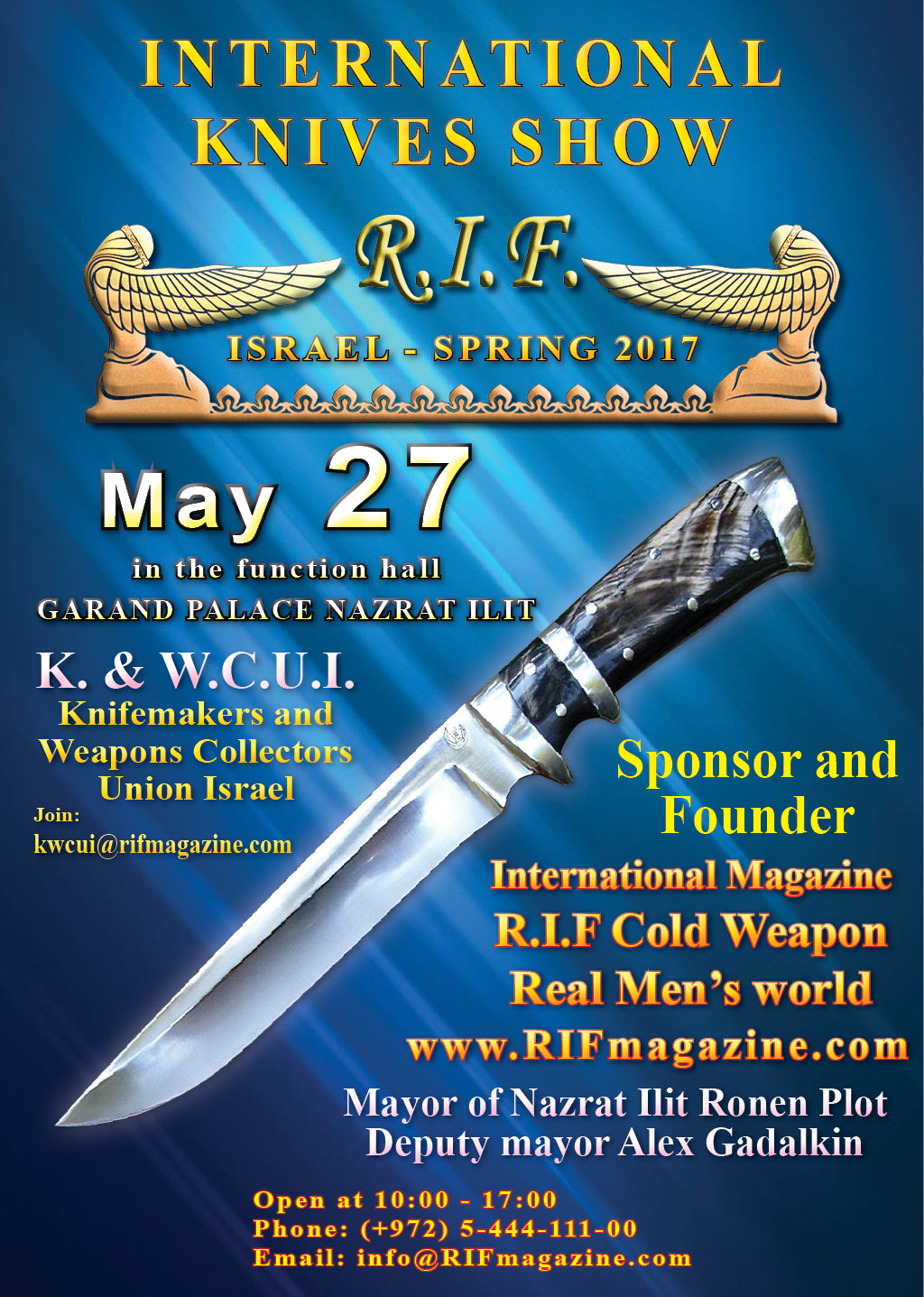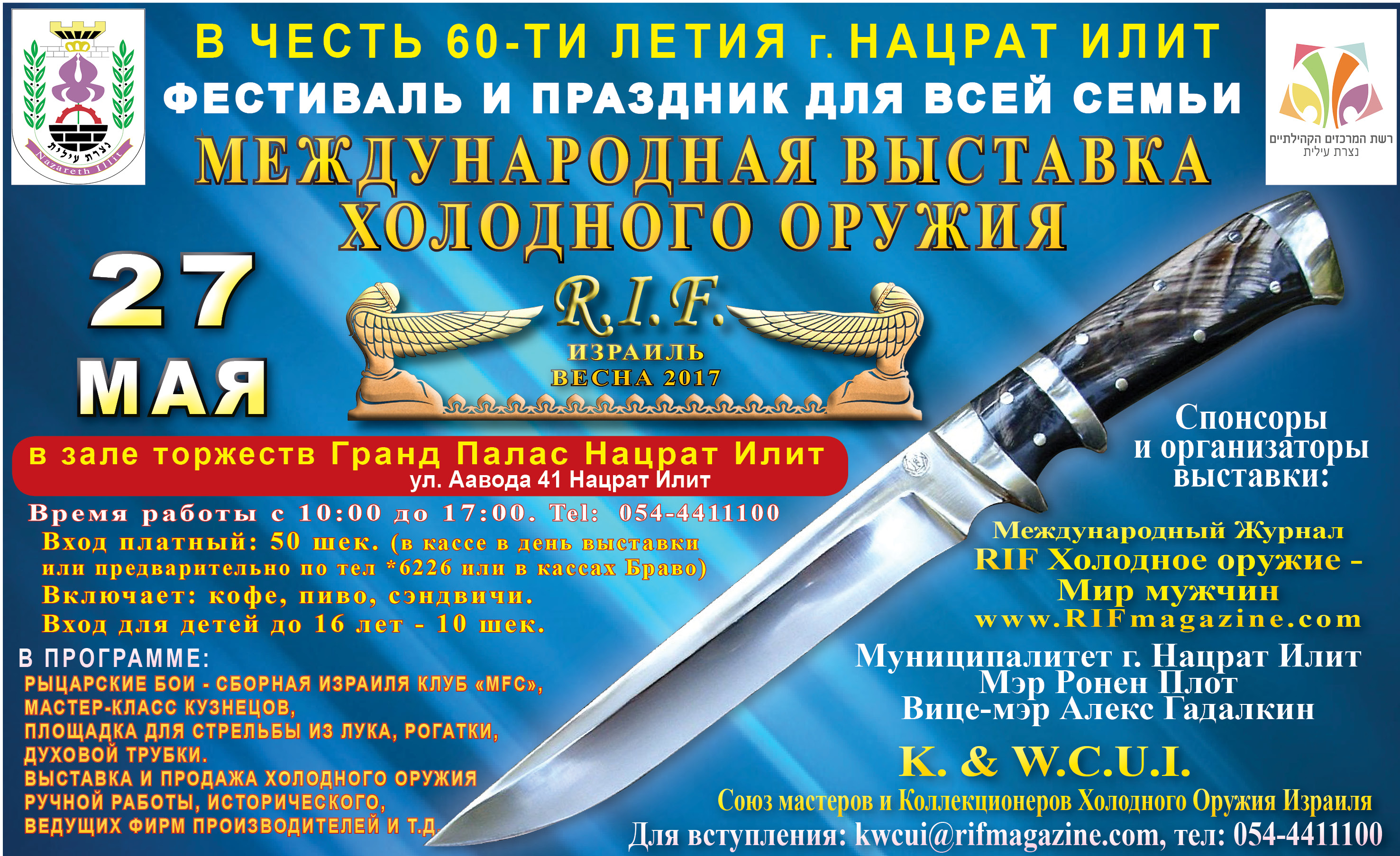 27 мая 2017 года в зале торжеств " Гранд Палас" г.Нацрат Илит состоится выставка-продажа холодного оружия «R.I.F. – Весна 2017». В честь 60-ти летия г.Нацрат Илит . Организатор и спонсор выставки – международный журнал о холодном оружии «R.I.F. Холодное Оружие: Мир Мужчин» - http://www.RIFmagazine.com, при поддержке и сотрудничестве с организацией «K.&W.C.U.I” - «Союз Мастеров и Коллекционеров Холодного Оружия Израиля» (для вступления в организацию “K.&W.C.U.I” email: KWCUI@rifmagazine.com) и муниципалитета г.Нацрат Илит мэра Ронена Плота и вице-мэра Алекса Гадалкина