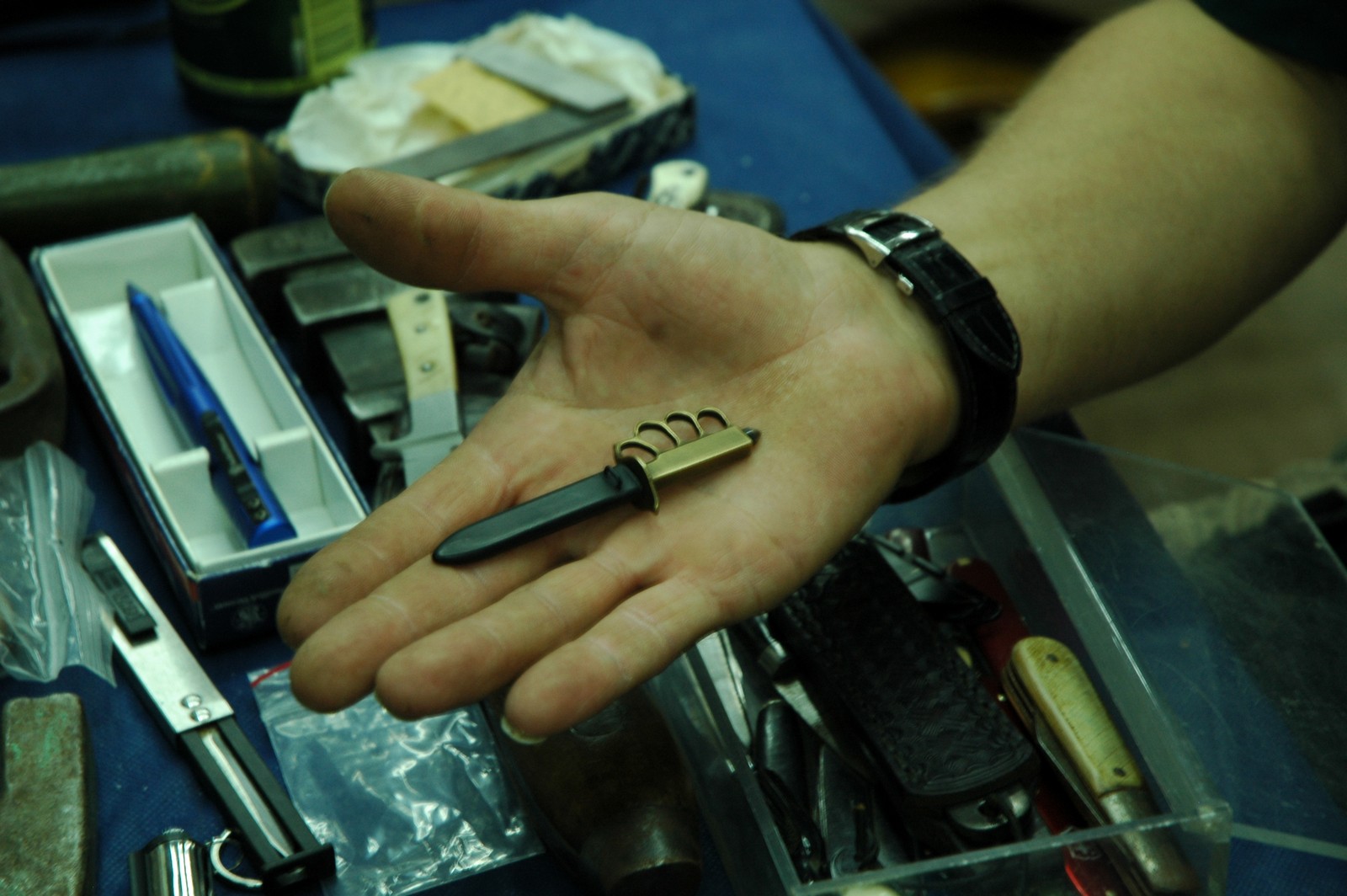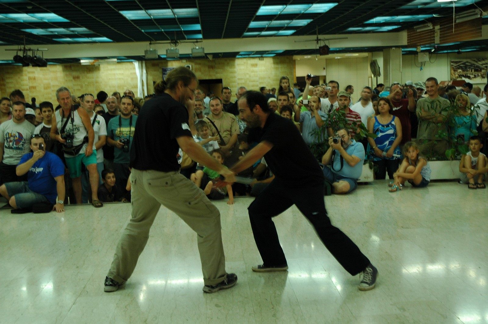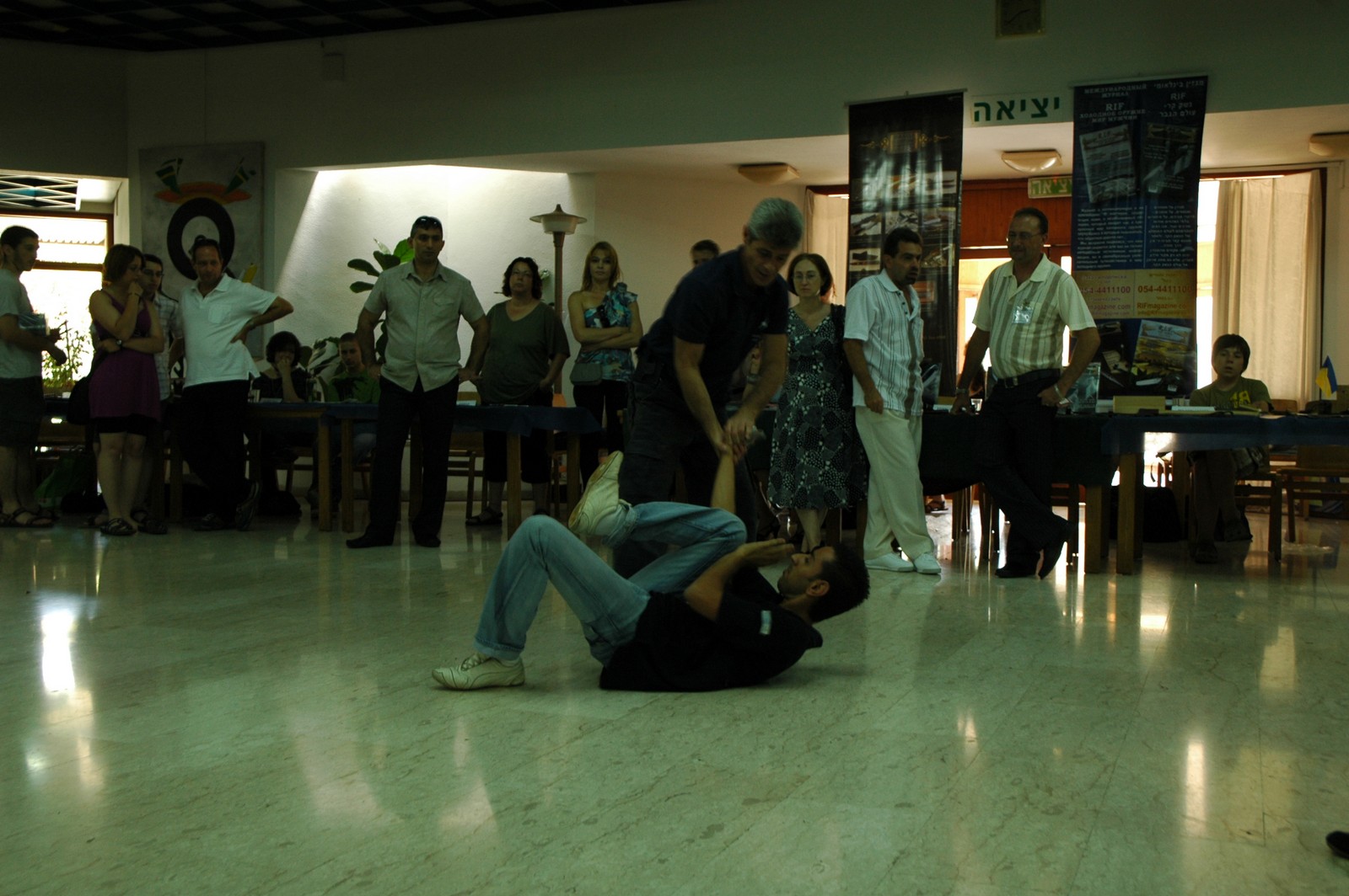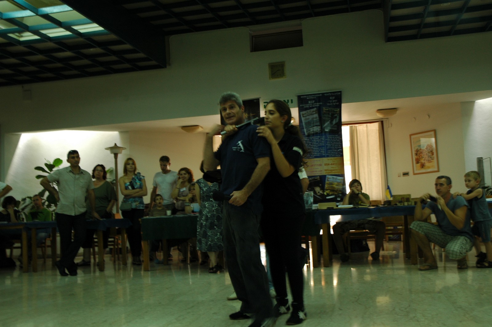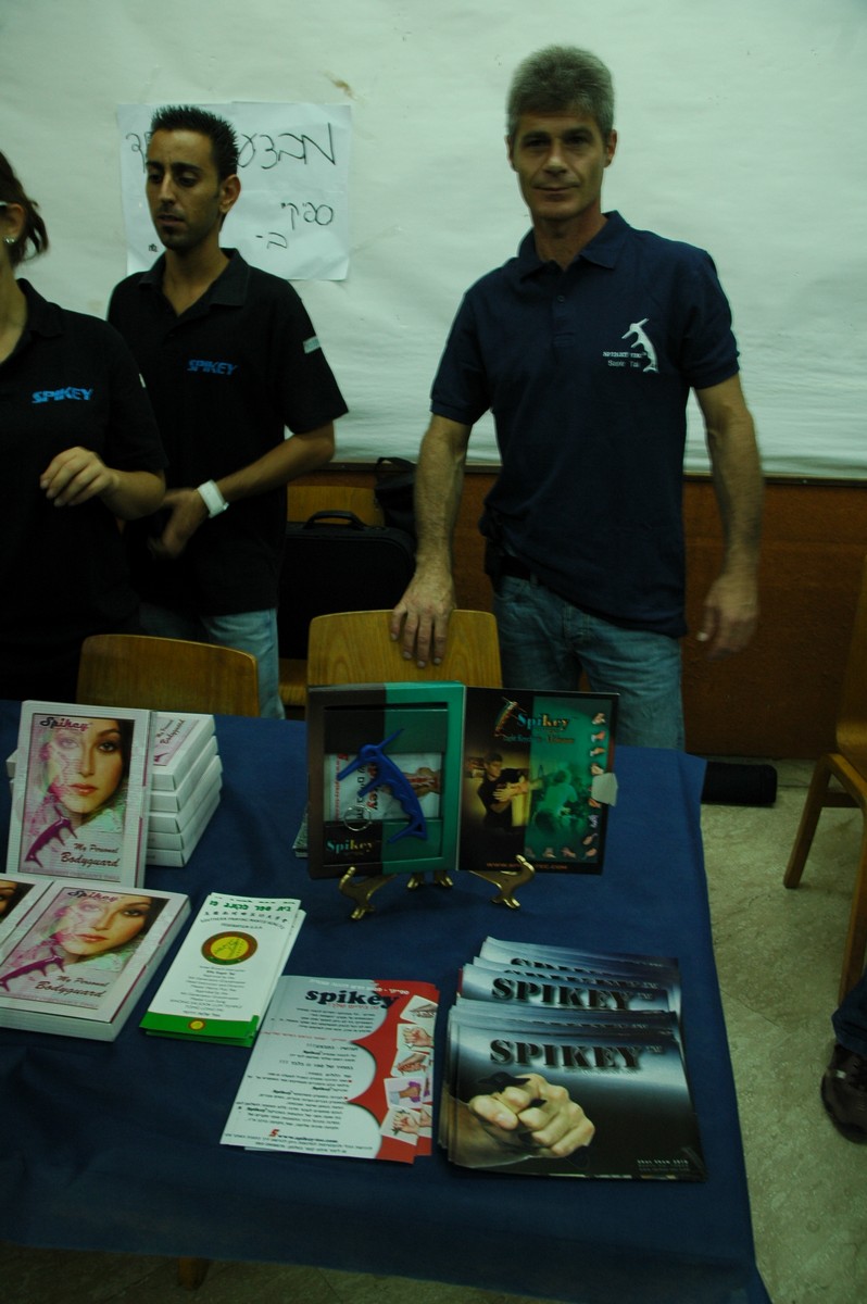 Приходил еще Сапир Таль, создатель системы "Спайки" и собственно самого "Спайки" - пластиковой ладонной штуки для самообороны с выступающими шипами. Он демонстрировал на симпатичной девушке, как надо этой самой штукой работать... :D Я про спайки говорю!
