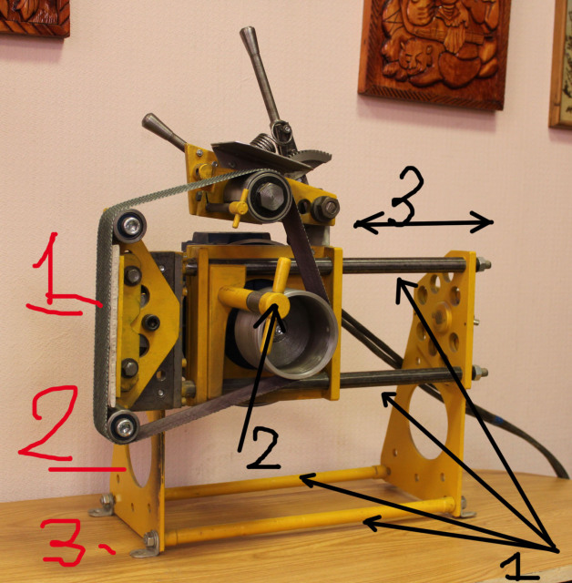 Конечно ещё и в плоскость если б всё это поворачивалось было б лучше, но в этой конструкции не предусмотрено. Вообще нужен ещё и гриндер под ленту на 100мм. если руки дойдут там попробую реализовать три плоскости.