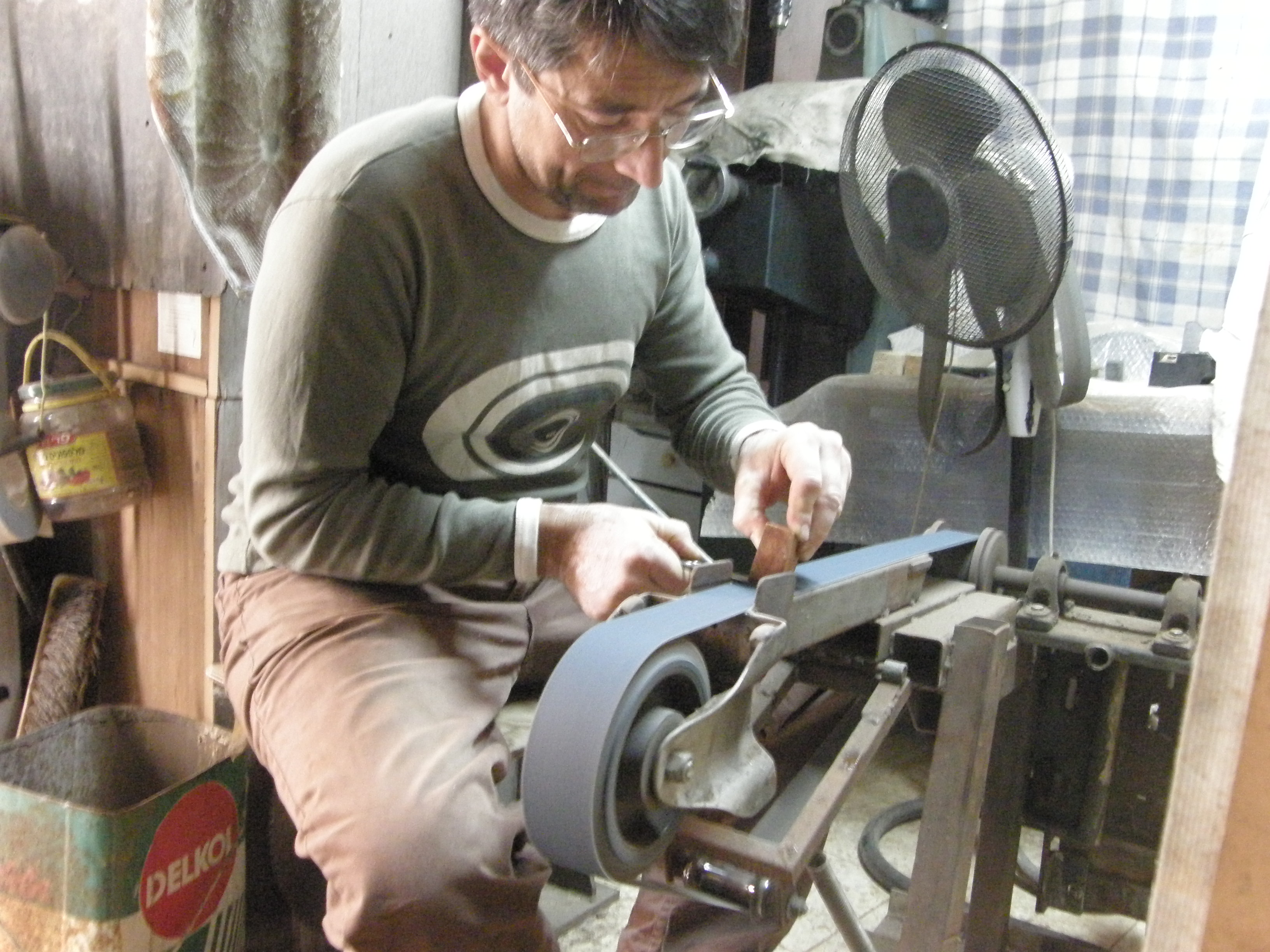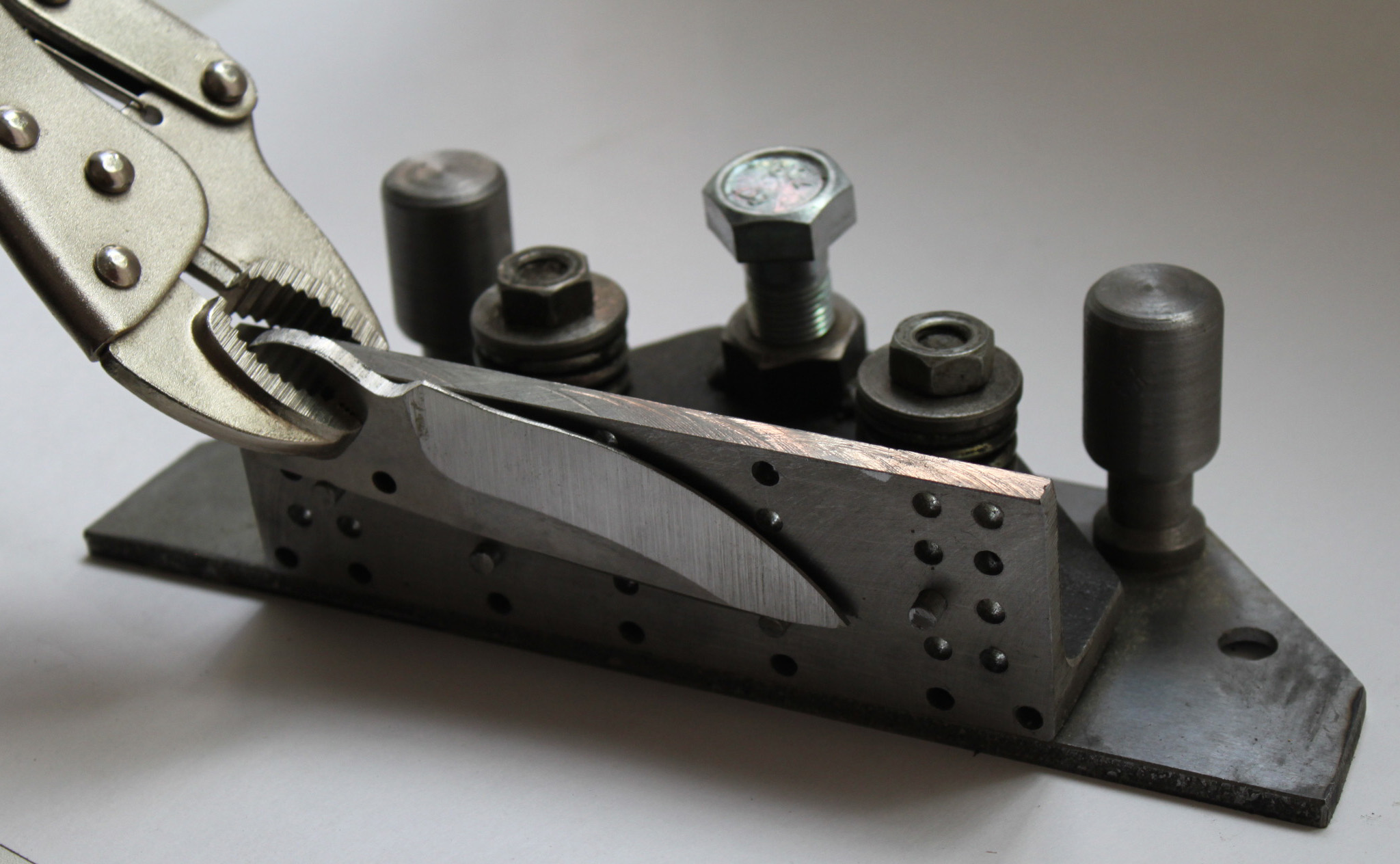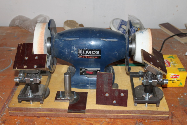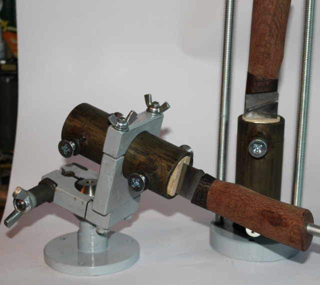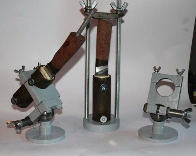 не успел за выходные сделать столик и подключить частотник, выложу пока приспособление для обработки рукоятей ножей. Из фото думаю всё понятно, крепиться к столу, нож зажимаеться за клинок, можно крутить во всех направлениях.