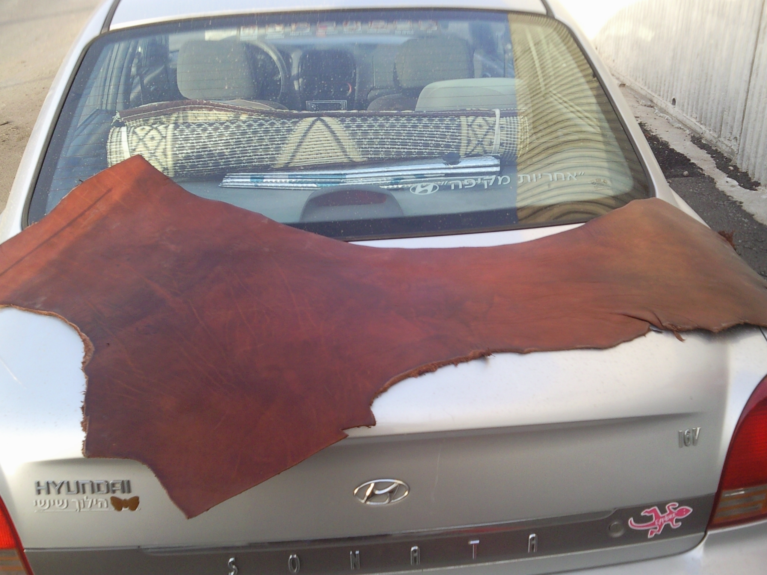 Аркадий, нашёл я и его, мужик оказался классный! Подарил мне кусок кожи, сказал что он стоит -5-10 шек, ему лень было квитанцию выписывать. Вот доказательство.