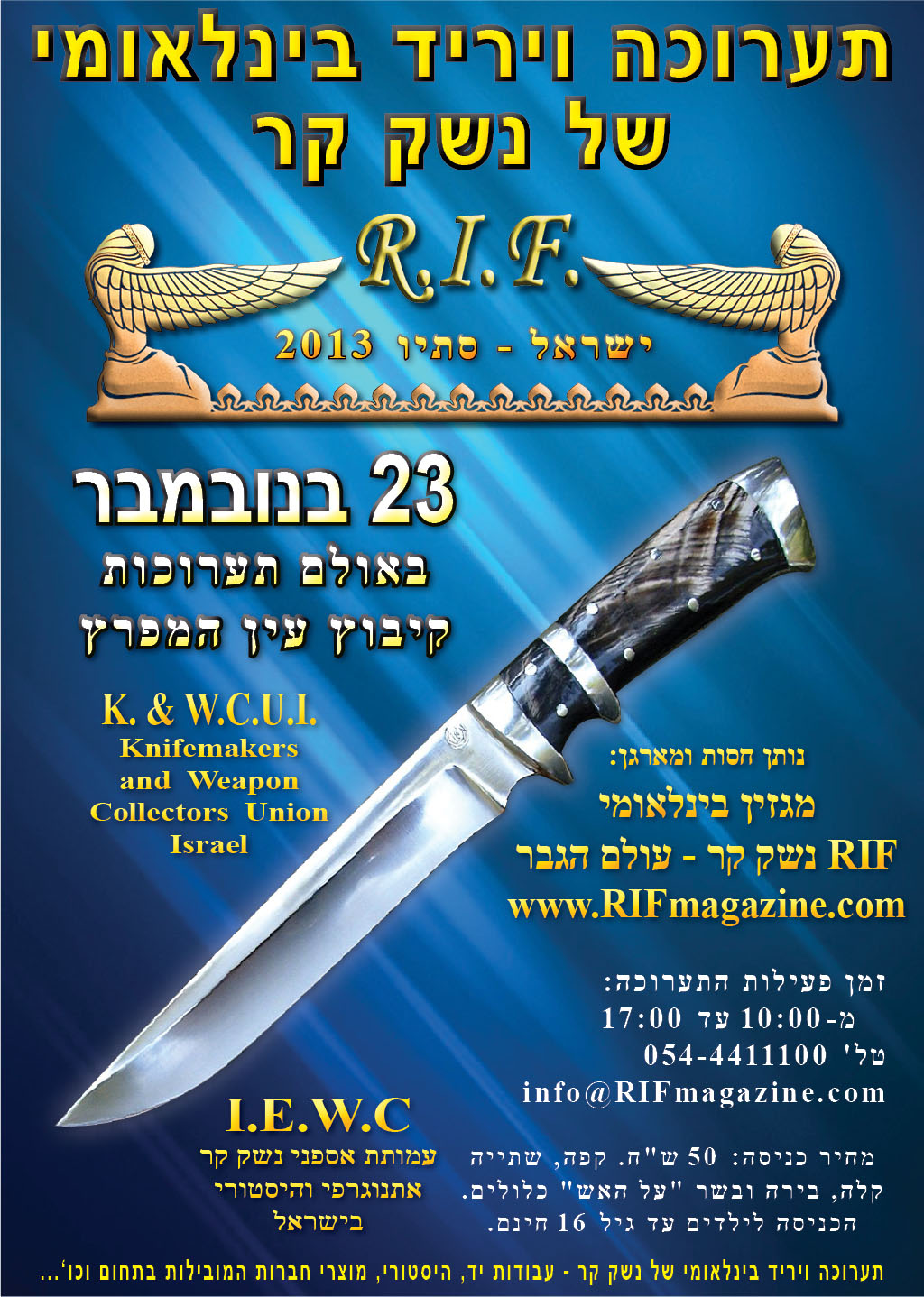 Выставка- продажа холодного оружия состоится 23 ноября 2013 года в выставочном зале кибуца Эйн–аМифрац. Организатор и спонсор выставки – международный журнал о холодном оружии «R.I.F. Холодное Оружие Мир Мужчин» - http://www.RIFmagazine.com при поддержке и сотрудничестве с организацией “K.&W.C.U.I” - «Союз Мастеров и Коллекционеров Холодного Оружия Израиля» (для вступления в организацию “K.&W.C.U.I” email: KWCUI@rifmagazine.com )