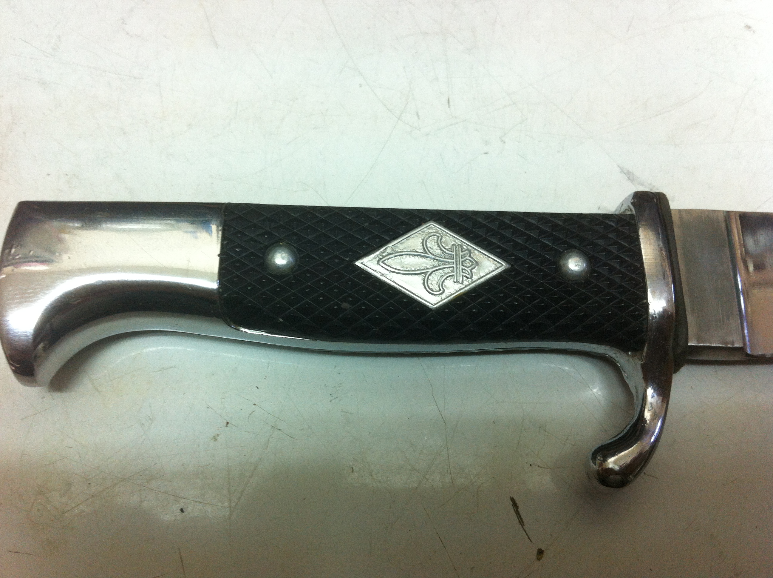 На классических ножах "Гитлерюгенд" рисунок эмалевого ромбика на рукоятке содержал изображение свастики, на клинке была надпись.