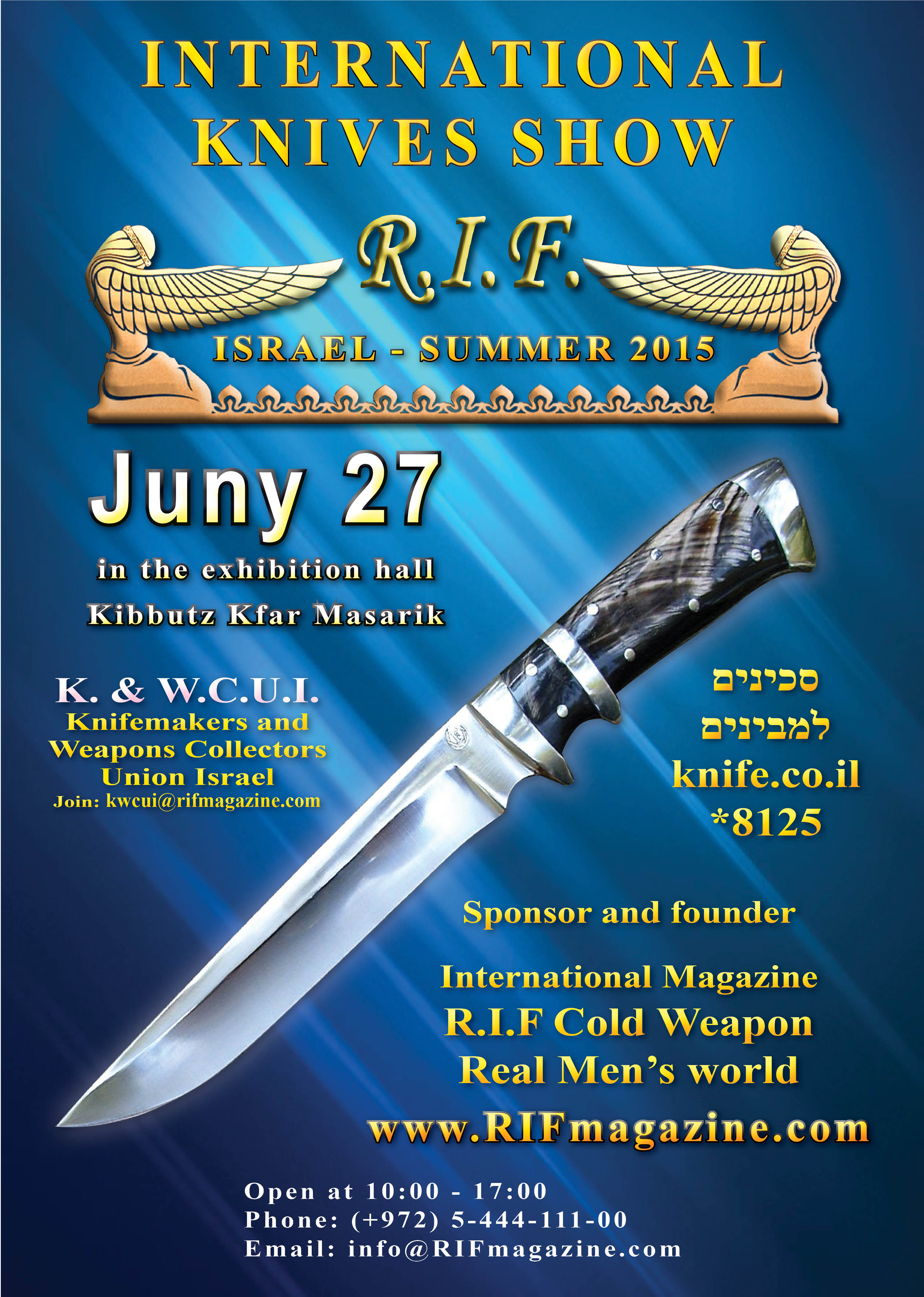 . Выставка-продажа холодного оружия состоится 27 июня 2015 года в выставочном зале кибуца Кфар Масарик. Организатор и спонсор выставки – международный журнал о холодном оружии «R.I.F. Холодное Оружие: Мир Мужчин» - http://www.RIFmagazine.com при поддержке и сотрудничестве с организацией “K.&W.C.U.I” - «Союз Мастеров и Коллекционеров Холодного Оружия Израиля» (для вступления в организацию “K.&W.C.U.I” email: KWCUI@rifmagazine.com )